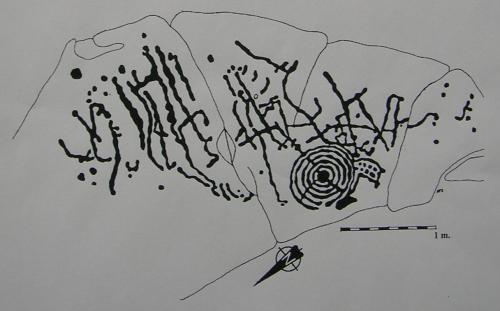 • Grupo II: Atópase sobre un afloramento granítico a ras do chan e parcialmente cuberto de terra, a 2 metros ao SE do Grupo I. O motivo representado é un círculo concéntrico ou ben unha espiral a esquerdas con cazoleta central e con motivos radiais na súa parte externa.