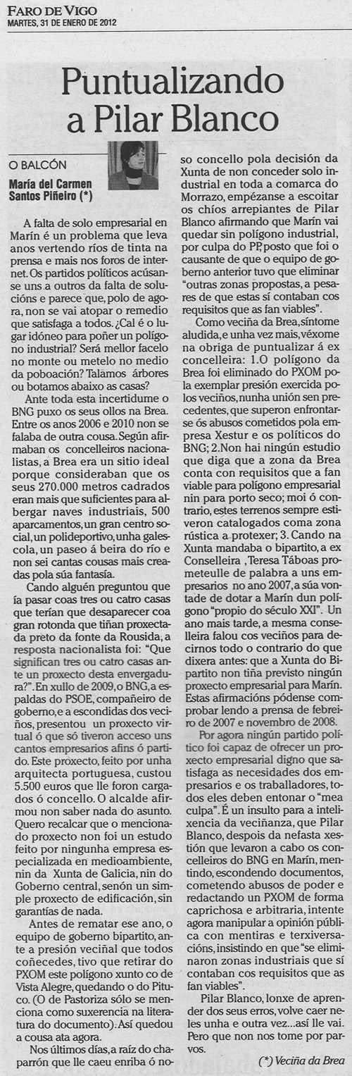 Pues desde el Concello la valoración que hacemos es, en primer lugar, que la zona incluida, una de ellas, de las del estudio de suelo empresarial de la Xunta de Galicia una de ellas está incluida en el planeamiento aprobado provisionalmente por Marín, que tiene una memoria ambiental aprobada por la propia consellería y que en estos momentos, nosotros, es el documento que una vez que tengamos todos los informes favorables de los organismos sectoriales, enviaremos para aprobación definitiva, tal y como está. Lo he dicho muchas veces. No estamos ya en el trámite ya de poner y quitar cosas. Es un documento que hay, cuenta con la mayoría de los informes favorables, estamos a la espera de lo último ya, para poder enviarlo a la Secretaría Xeral de Urbanismo, que vaya a la Comisión Superior de Urbanismo, y que Marín pueda contar, después de 33 años, con un planeamiento.