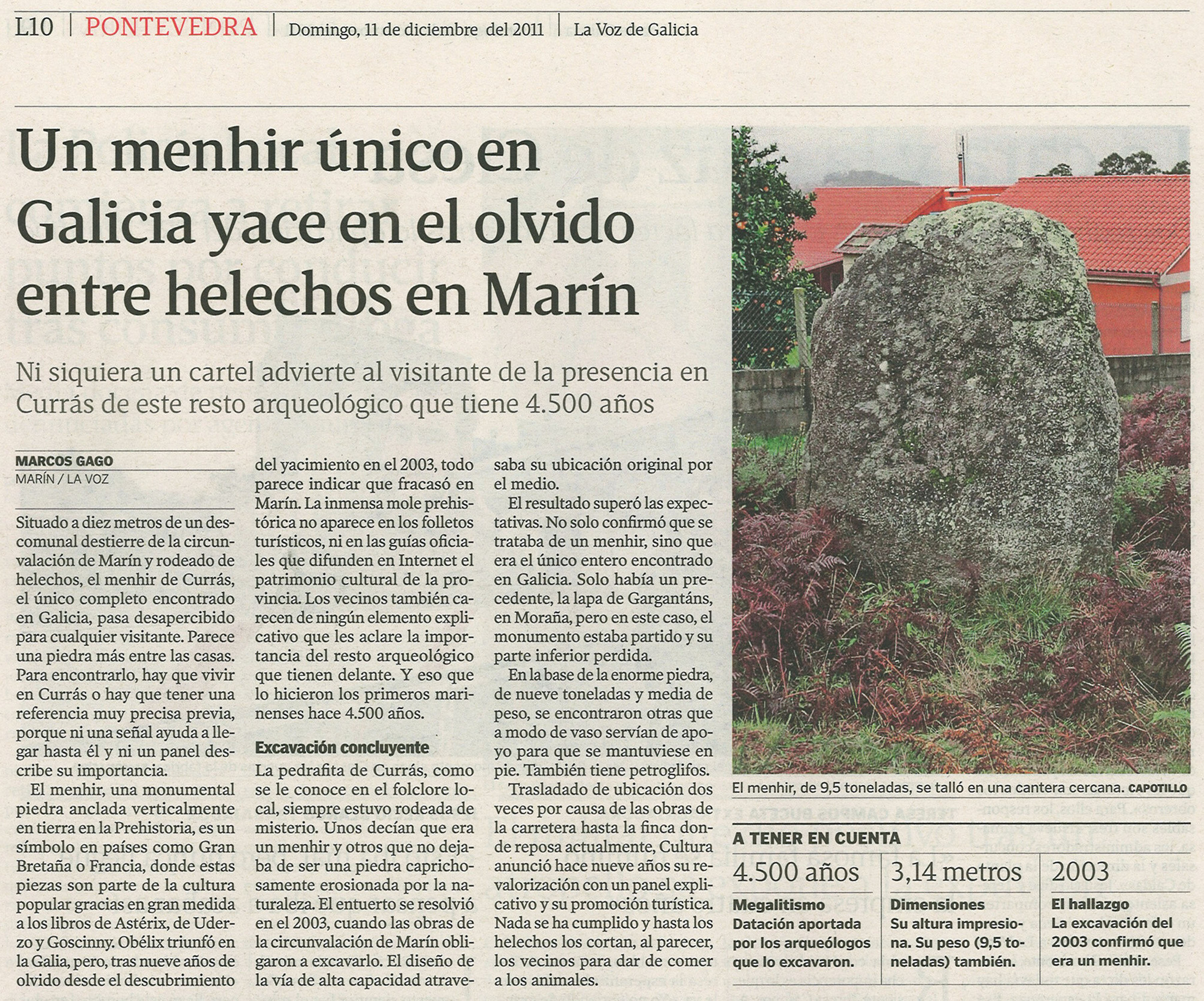 Este fin de semana atopámonos na edición local de La Voz de Galicia cun interesante e oportunísimo artigo de Marcos Gago sobre o menhir de Currás. Xa este verán pasado -e dende moito antes tamén debía ser así- era evidente o estado de deixadez e abandono no que se atopa: rodeado de maleza nunha finca a monte, a carón dunha pista e ao pé dun dos impresionantes taludes que obrigou a facer a construcción da variante de Marín. Ningunha sinalización nin tratamento museográfico que advirta da importancia desta excepcional peza megalítica, que debera contar con algún tipo de protección para garantir que non sofra agresións e se poida conservar nun entorno digno.